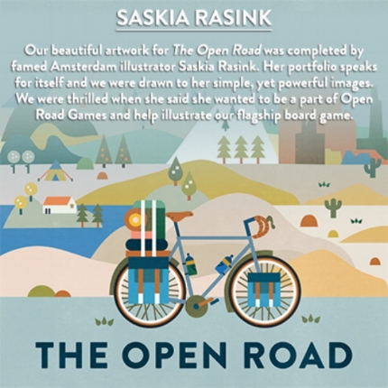 As the game play was evolving we reached out to a brilliant illustrator from Amsterdam named Saskia Rasink. She took a chance on us because she liked the idea of illustrating a game which was something new to her. If you look at her website (saskiarasink.nl) she is quite the celebrated illustrator. So we were thrilled when she said she would work with us. She ended up making our dreams a reality. Her professionalism, her style, her ability to convey what we wanted was so essential to our growth. We owe so much to her and all of the illustrations you see in The Open Road are her original designs.